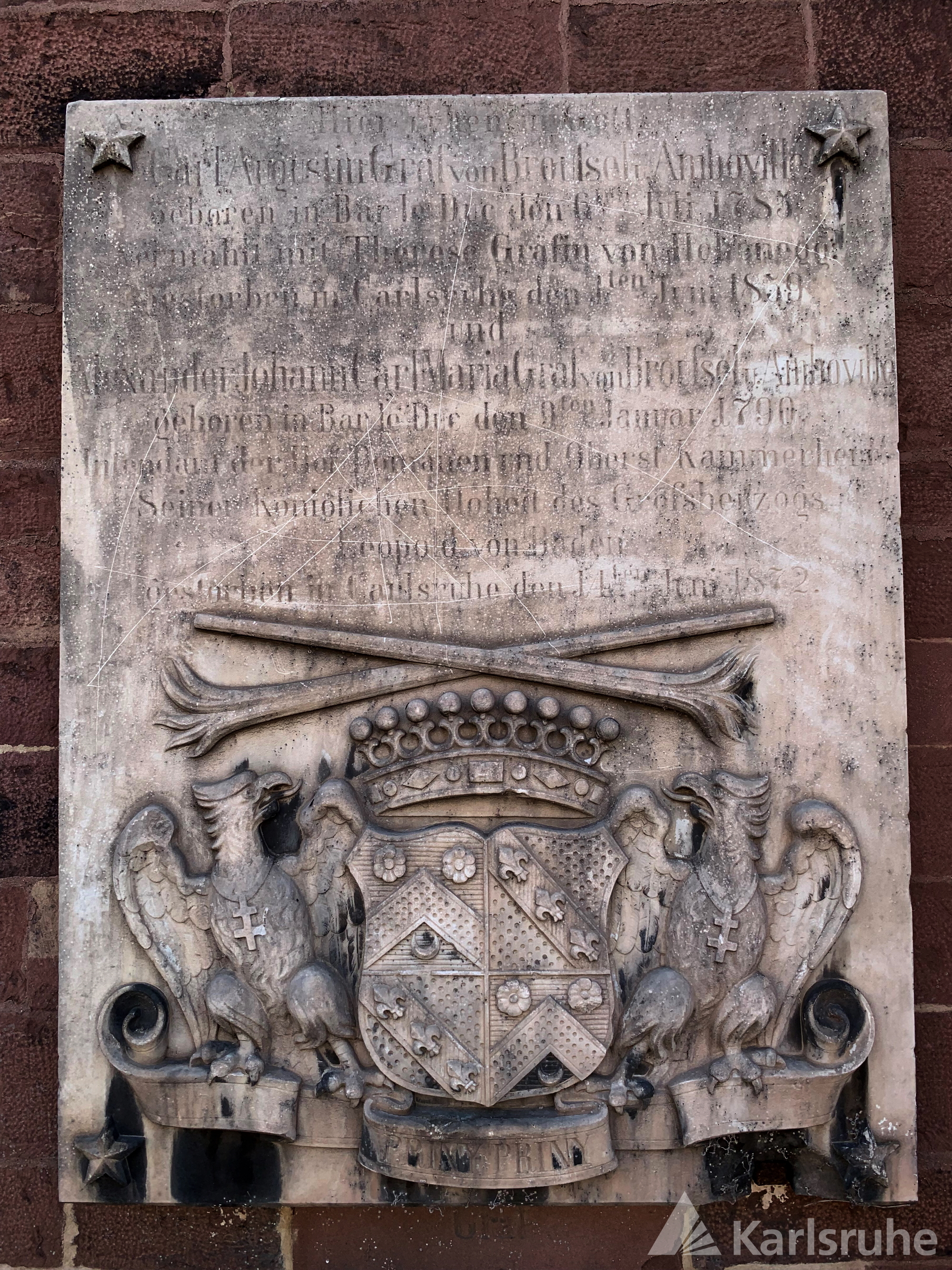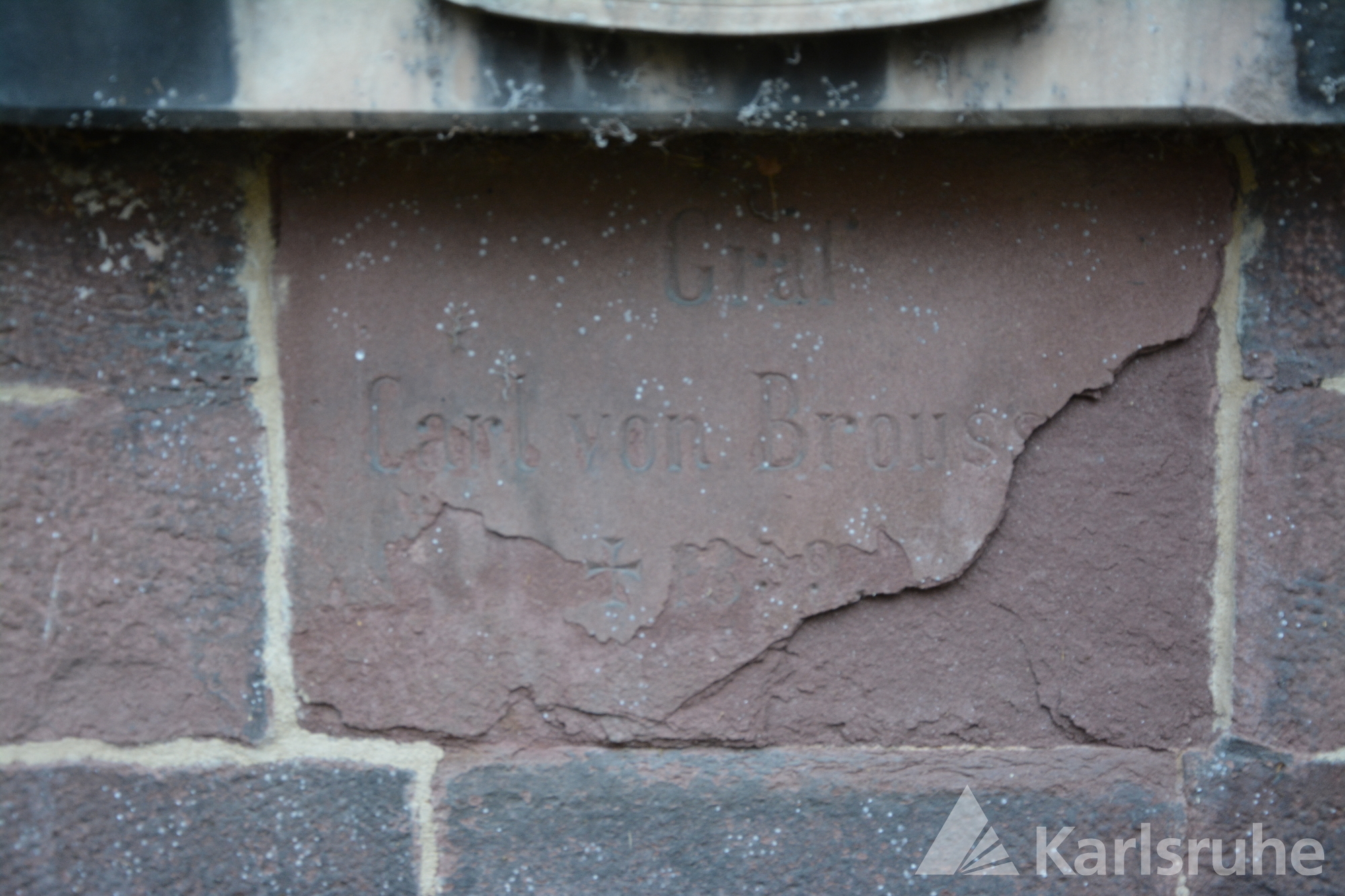 Die Rotsandsteinplatte in der Mauer dürfte anlässlich der Beerdigung des Grafen Carl von Broussel 1859 angebracht worden sein. Nachdem 1872 auch sein Bruder Alexander in dieser Gruft beigesetzt worden war, brachte man die Wandplatte aus weißem Marmor, die auf die beiden hier Bestatteten verweist, über der ursprünglichen Platte an.