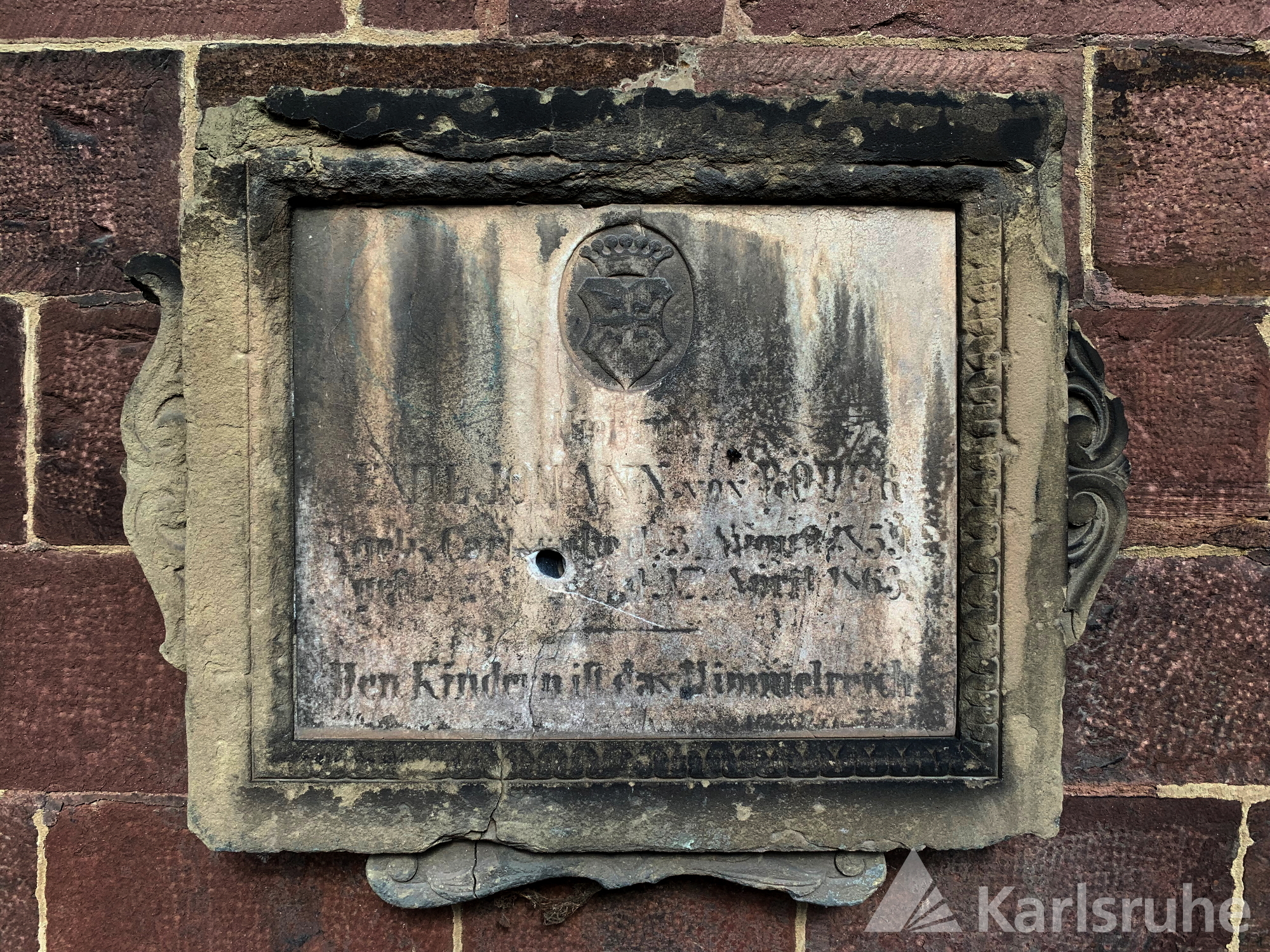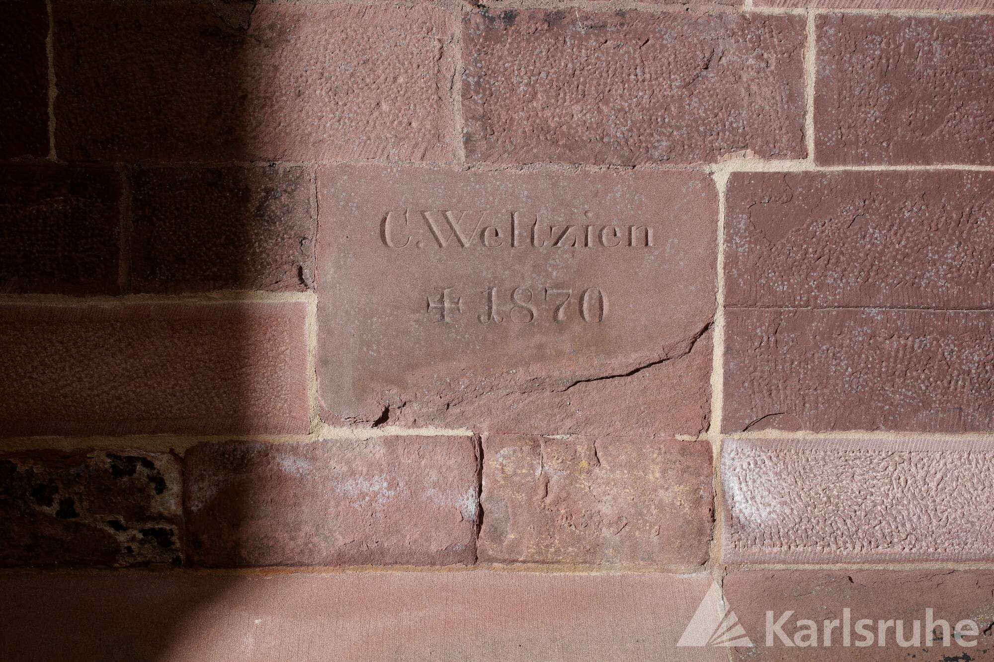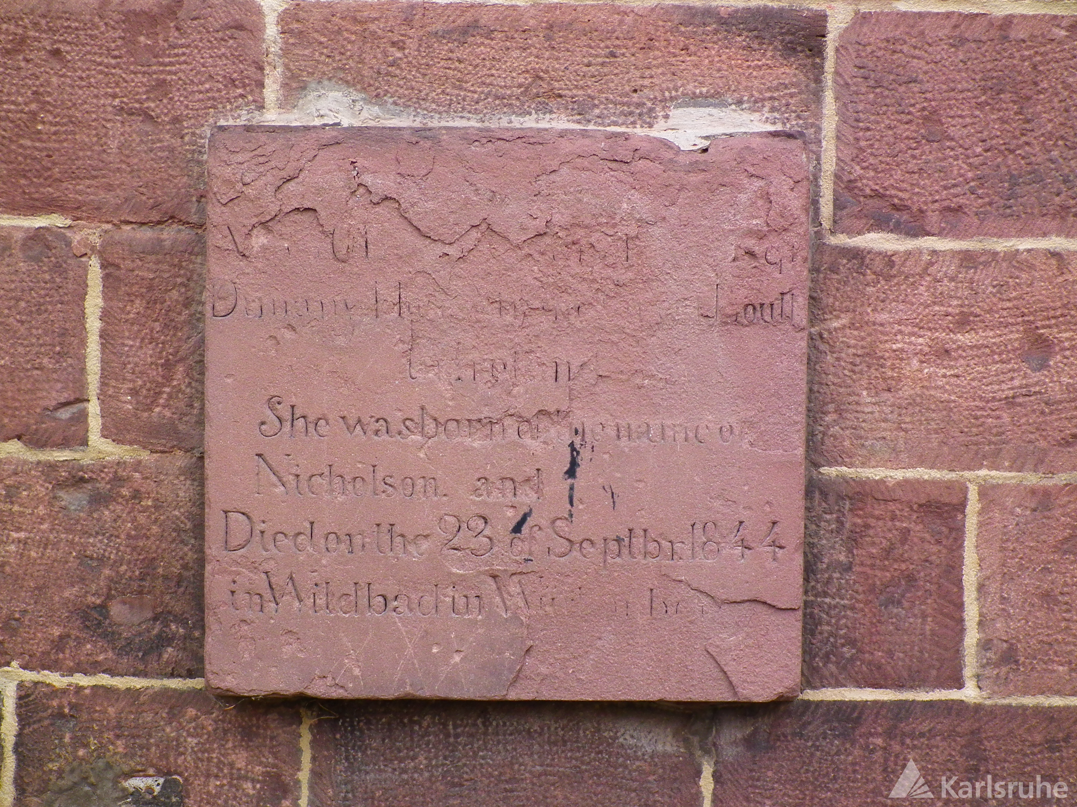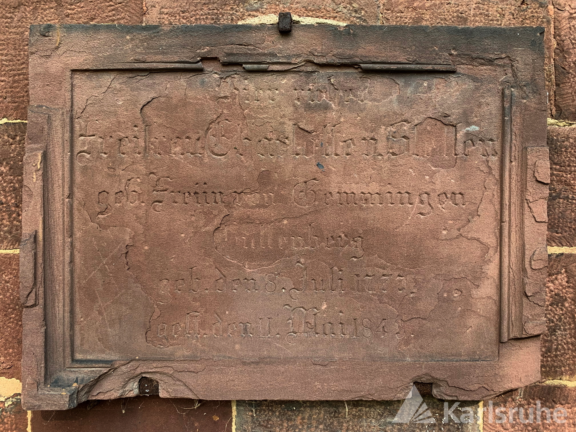 Stark verwitterte Platte aus rotem Sandstein, 44 x 46 cm. Die Platte ist heute nicht mehr vorhanden (Stand 2023).