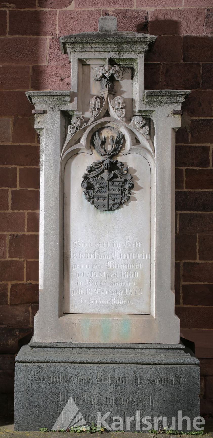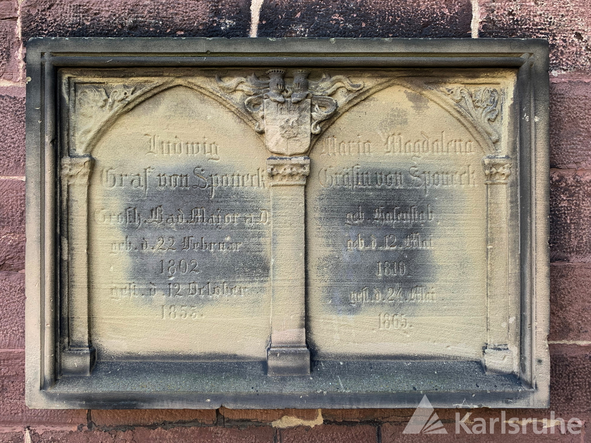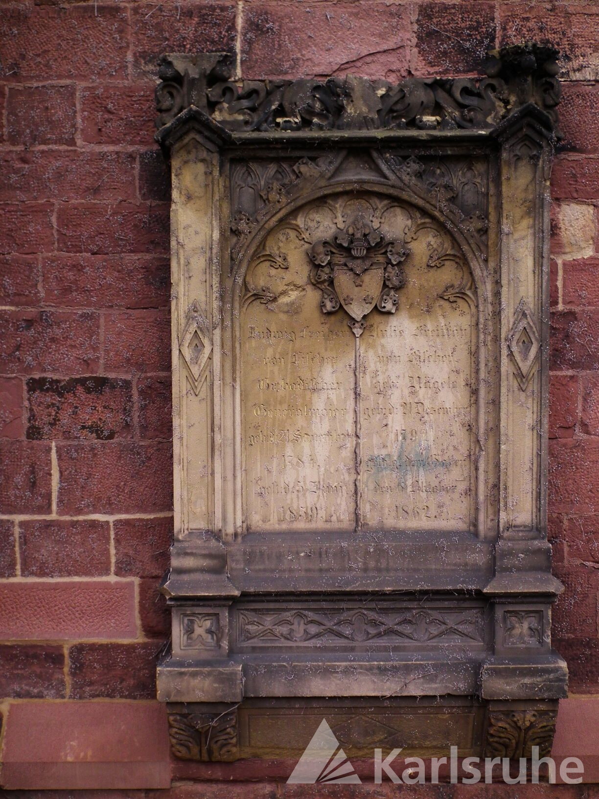 Gelber Sandstein in neogotischer Gestaltung mit Heiratswappen (rechts Stockhorner von Starein, links Röder von Diersburg), 205 x 80 x 20 cm