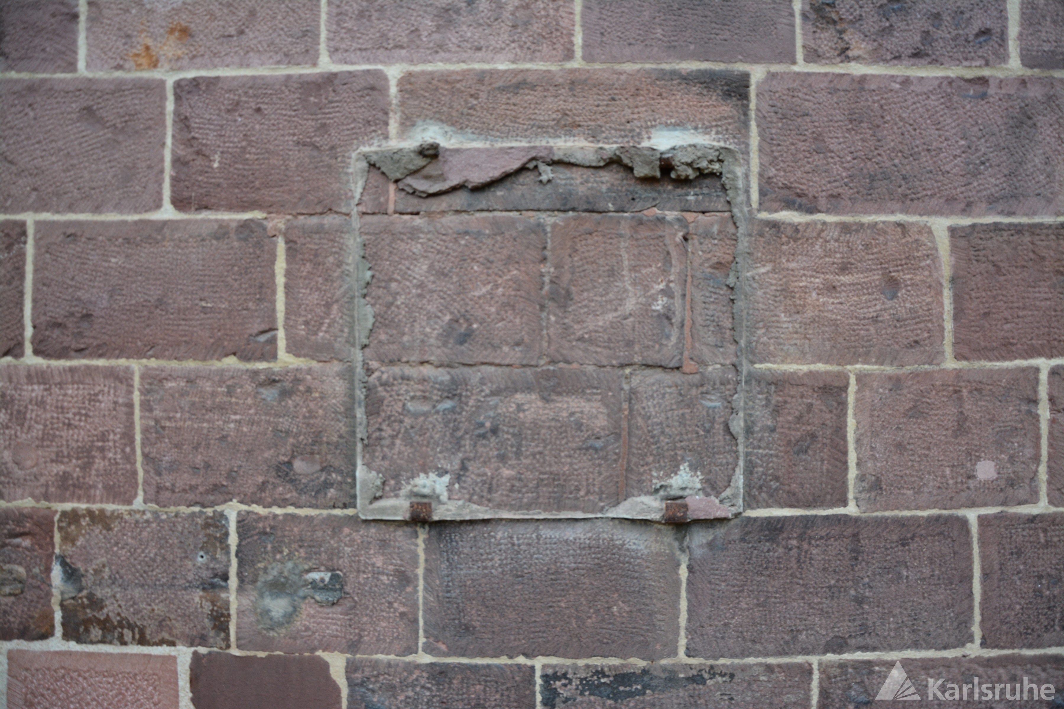 Unter der Wandplatte aus Marmor eine als Mauerstein behandelte Rotsandsteinplatte, 29 x 44 cm