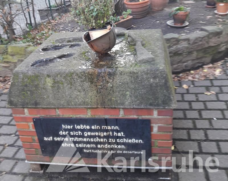 Es wurde am 5. Mai 1990 auf dem Marktplatz enthüllt und fand nach der Weigerung der Stadt Karlsruhe, einen Standort im öffentlichen Raum zur Verfügung zu stellen, einen vorläufigen Platz im Gewerbehof. Das Bodendenkmal wurde 2005 durch das Friedensbündnis Karlsruhe und den Trägerverein des Gewerbehofes saniert, durch einen gemauerten Sockel erhöht und die Tafel mit der Inschrift hier lebte ein mann, / der sich geweigert hat, / auf seine mitmenschen zu schießen. / ehre seinem andenken. / kurt tucholsky, für die deserteure erneuert.