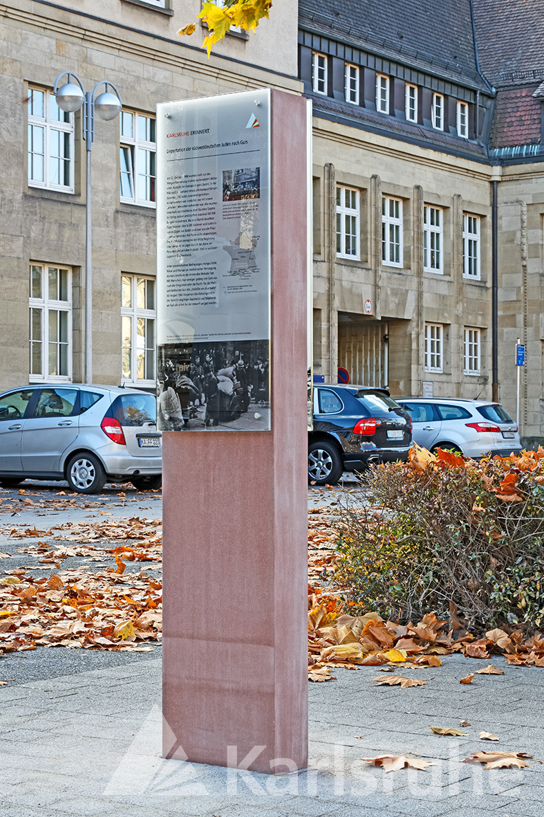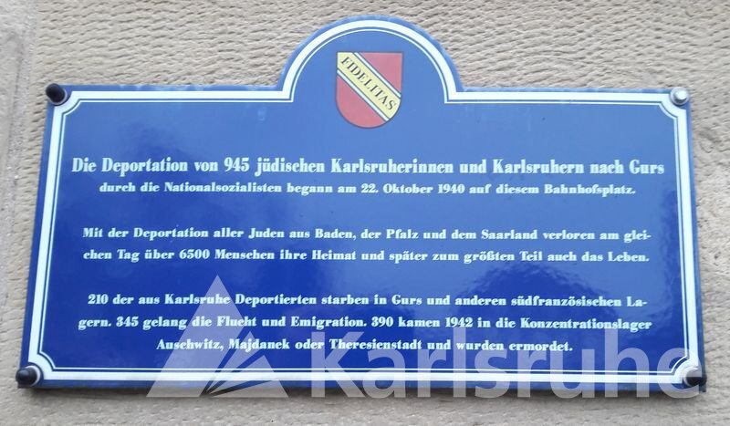 Die Deportation von 945 jüdischen Karlsruherinnen und Karlsruhern nach Gurs / durch die Nationalsozialisten begann am 22. Oktober 1940 auf diesem Bahnhofsplatz. / Mit der Deportation aller Juden aus Baden, der Pfalz und dem Saarland verloren am glei- / chen Tag über 6500 Menschen ihre Heimat und später zum größten Teil auch das Leben. / 210 der aus Karlsruhe Deportierten starben in Gurs und anderen südfranzösischen La- / gern. 345 gelang die Flucht und Emigration. 390 kamen 1942 in die Konzentrationslager / Auschwitz, Majdanek oder Theresienstadt und wurden ermordet.