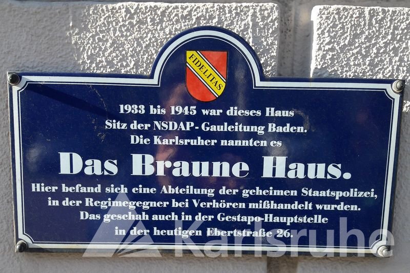1993 wurde am Gebäude des ehemaligen "Braunen Hauses" eine blaue Emaille-Tafel angebracht. Die Inschrift lautet: 1933 bis 1945 war dieses Haus / Sitz der NSDAP- Gauleitung Baden. / Die Karlsruher nannten es / Das Braune Haus. / Hier befand sich eine Abteilung der geheimen Staatspolizei, / in der Regimegegner bei Verhören mißhandelt wurden. / Das geschah auch in der Gestapo-Hauptstelle / in der heutigen Ebertstraße 26.