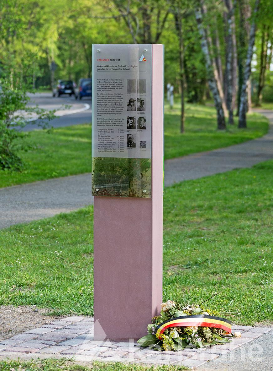 Außerdem wurde dort ein Gedenkstein für die Opfer in Form eines Obelisken aus rotem Sandstein errichtet (Höhe 167 cm, Breite und Tiefe 80 cm). Seine Inschrift lautet FLIEGER / OPFER / RUSSISCHER / U. PONISCHER / NATION / 1939 - 1945. Der Entwurf des Ehrenmals stammt vom Stadtplanungsamt Karlsruhe. Die Todesdaten bis 1947 verweisen darauf, dass dort nicht nur Luftkriegsopfer bestattet sind, sondern auch nach Kriegsende verstorbene Zwangsarbeiterinnen und -arbeiter, die noch nicht in ihre Heimatländer zurückgekehrt oder in andere Länder ausgewandert waren.