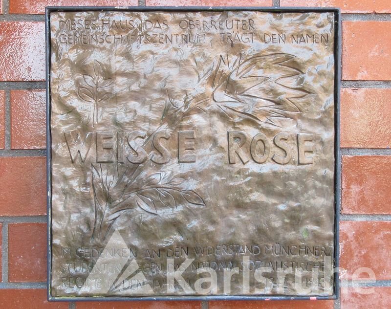 DIESES HAUS, DAS OBERREUTER / GEMEINSCHAFTSZENTRUM, TRÄGT DEN NAMEN / WEISSE ROSE / IM GEDENKEN AN DEN WIDERSTAND MÜNCHNER / STUDENTEN GEGEN DAS NATIONALSOZIALISTISCHE / REGIME IN DEN JAHREN 1942 - 1943