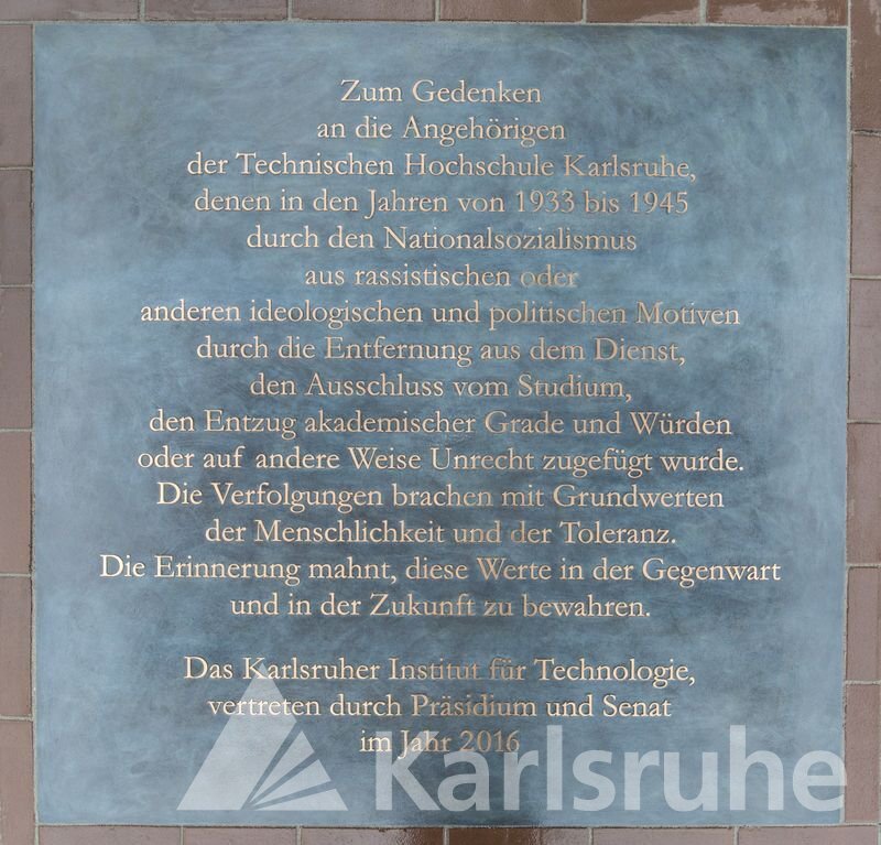 Zum Gedenken / an die Angehörigen / der Technischen Hochschule Karlsruhe, / denen in den Jahren von 1933 bis 1945 / durch den Nationalsozialismus / aus rassistischen oder / anderen ideologischen und politischen Motiven / durch die Entfernung aus dem Dienst, / den Ausschluss vom Studium, / den Entzug akademischer Grade und Würden / oder auf andere Weise Unrecht zugefügt wurde. / Die Verfolgungen brachen mit Grundwerten / der Menschlichkeit und Toleranz. / Die Erinnerung mahnt, diese Werte in der Gegenwart / und in der Zukunft zu bewahren. / / Das Karlsruher Institut für Technologie, / vertreten durch das Präsidium und Senat / im Jahr 2016