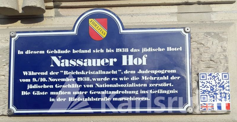 1994 wurde am Gebäude des ehemaligen Hotels Nassauer Hof eine blaue Emaille-Tafel angebracht. Die Inschrift lautet: In diesem Gebäude befand sich bis 1938 das jüdische Hotel / Nassauer Hof / Während der "Reichskristallnacht", dem Judenpogrom / vom 9./10. November 1938, wurde es wie die Mehrzahl der / jüdischen Geschäfte von Nationalsoziallisten zerstört. / Die Gäste mußten unter Gewaltandrohung ins Gefängnis / in der Riefstahlstraße marschieren.