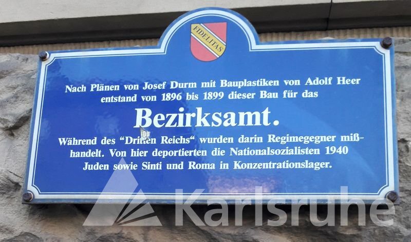 1995 wurde am Gebäude des ehemaligen Bezirksamts eine blaue Emaille-Tafel angebracht. Die Inschrift lautet: Nach Pänen von Josef Durm mit Bauplastiken von Adolf Heer / entstand von 1896 bis 1899 dieser Bau für das / Bezirksamt. / Während des "Dritten Reichs" wurden darin Regimegegner miß- / handelt. Von hier deportierten die Nationalsozialisten 1940 / Juden sowie Sinti und Roma in Konzentrationslager.
