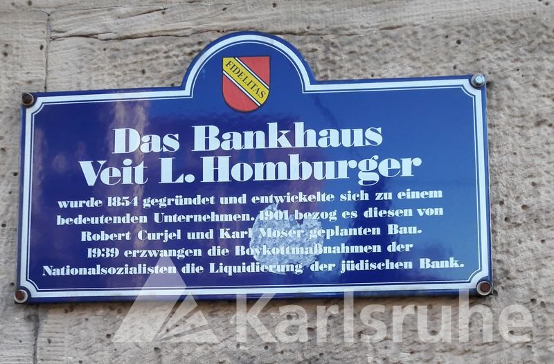 1994 wurde am Gebäude des ehemaligen Bankhauses Veit L. Homburger eine blaue Emaille-Tafel angebracht. Die Inschrift lautet: Das Bankhaus Veit L. Homburger / wurde 1854 gegründet und entwickelte sich zu einem bedeutenden Unternehmen. 1901 bezog es diesen von Robert Curjel und Karl Moser geplanten Bau. 1939 erzwangen die Boykottmaßnahmen der Nationalsozialisten die Liquidierung der jüdischen Bank.