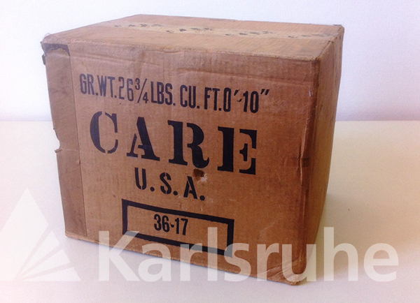 Für viele Menschen waren die CARE-Pakete eine wichtige, kalorienreiche Hilfe. Das hier gezeigte Paket wurde dem Pfinzgaumuseum Ende 1995 geschenkt - ohne den Inhalt, den die ursprünglichen Empfänger wahrscheinlich gleich nach Erhalt verspeist hatten. CARE-Pakete wie dieses gelten noch heute als Symbol für die deutsch-amerikanische Freundschaft und die Solidarität mit Not leidenden Menschen.