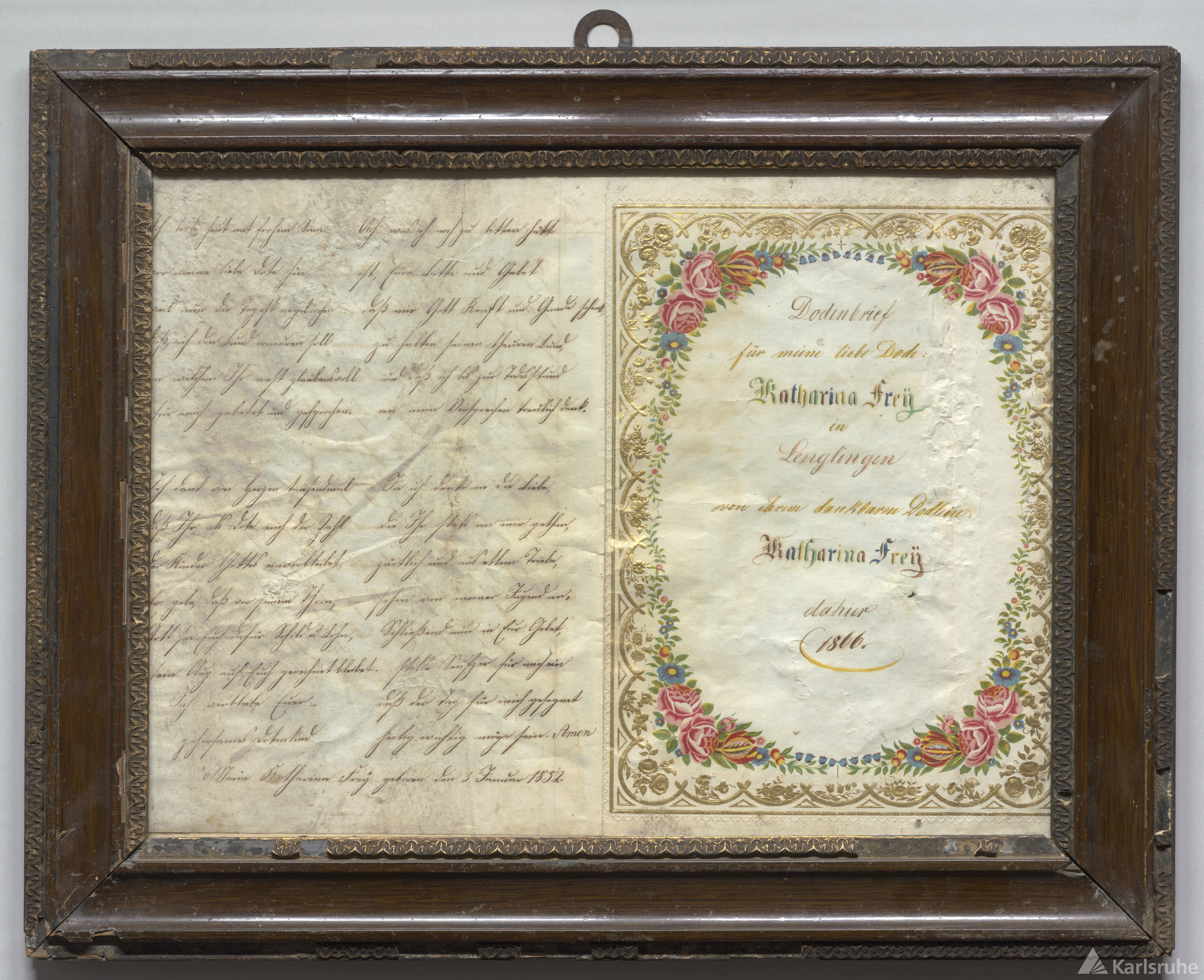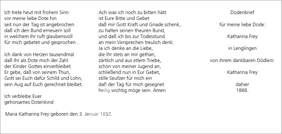 Anlässlich ihrer Konfirmation schrieb Katharina an ihre Patentante, auf schwäbisch „Dode“, diesen Brief. Paten sind als Taufzeugen für die christliche Glaubenserziehung des Kindes verantwortlich. Als äußeres Zeichen dieser Verbindung erhielt Katharina den gleichen Vornamen wie ihre Patin. Mit dem Tag der Konfirmation endet die Patenschaft. Im 18./19. Jahrhundert war es ein weit verbreiteter Brauch, dass Konfirmanden einen Dankbrief an ihre Paten verfassten. Die meist kunstvoll verzierten und gereimten Schreiben wurden sorgfältig aufbewahrt und oft weitervererbt.