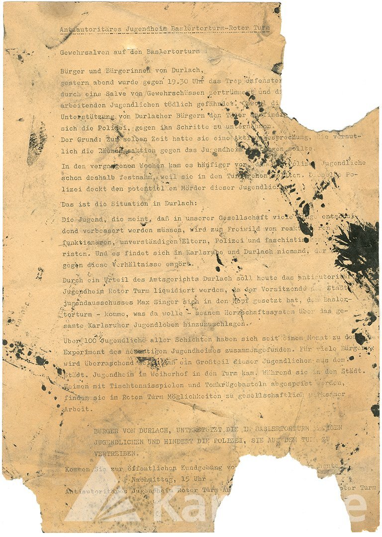 Als Reaktion auf die als Unrecht empfundene Kündigung und als Zeichen ihrer sozialistischen Gesinnung hissten sie am Basler Tor eine rote Fahne und gründeten am 28. März 1969 das "Antiautoritäre Jugendheim Roter Turm". Im April 1969 stürmte eine Gruppe von NPD-Mitgliedern den Turm, holte die rote Fahne ein und beschädigte Einrichtungsgegenstände. Zu einem weiteren Vorfall kam es am Abend des 8. Mai 1969. Ein Durlacher feuerte 15 Schüsse aus einem Kleinkalibergewehr auf ein erleuchtetes Fenster des Basler Tors. Die Scheibe zerbrach, doch es wurde niemand verletzt. Die Jugendheim- Aktivisten beklagen in dem gezeigten Flugblatt, dass nichts gegen den Schützen unternommen worden sei, obwohl die im Turm "arbeitenden Jugendlichen tödlich gefährdet" gewesen seien. Das Flugblatt verweist auch auf die gesellschaftlichen Veränderungen, die die jungen Leute forderten. Es ging ihnen neben politischen und soziologischen Fragen auch um sexuelle Freiheit für Jugendliche.