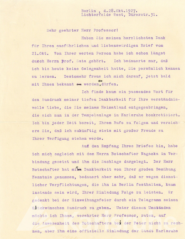 Gräffs Kontakte und sein bis nach Japan reichender guter Ruf ermöglichten es, dass der Schrein und auch die Schutzlöwen von Künstlern aus der Stadt Nagoya gefertigt wurden. Die japanische Stadt übernahm die Kosten dafür, sodass Karlsruhe nur die Material- und Transportkosten zu tragen hatte. Mit dem Schiff wurden die Kunstwerke schließlich nach Karlsruhe gebracht und im Herbst 1927 im Japangarten aufgestellt. Zu der aufwändig geplanten Übergabe des Schreins an die Stadt, zu der dank Siegfried Gräff zahlreiche japanische Vertreter geladen waren kam es jedoch nicht mehr. Der badische Staatspräsident Heinrich Köhler hatte seine Teilnahme überraschend zurückgezogen, nachdem in der Presse fälschlicherweise behauptet worden war, dass der Schrein auch geweiht werden sollte. Zunächst wollte man die Veranstaltung daraufhin nur verschieben, letztlich fand sie dann aber nicht mehr statt. Der Stadt Nagoya wurden zum Dank Fotos des aufgestellten Schreins übersendet, die beiden Künstler erhielten Kunstwerke der Majolika.