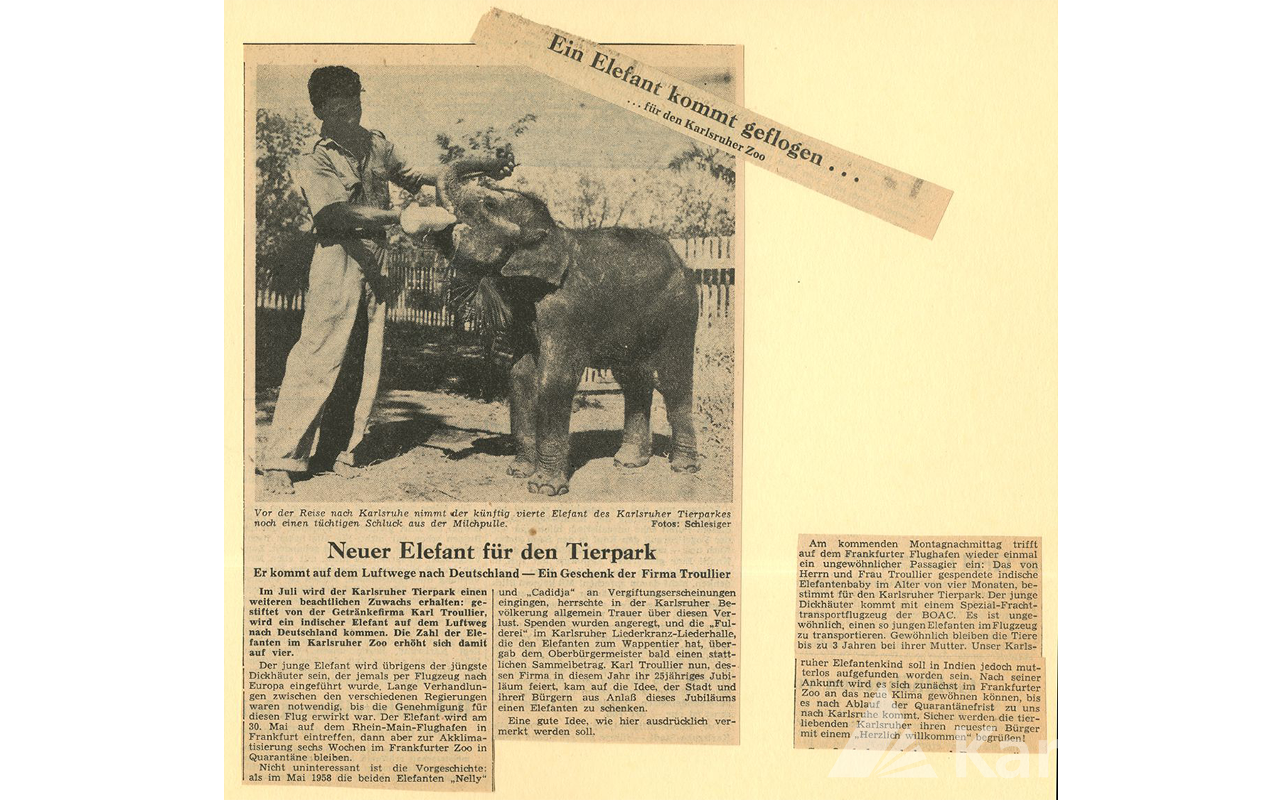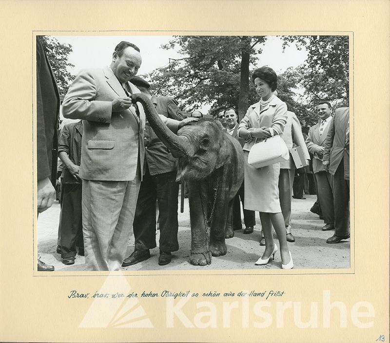 So titelte ein Zeitungsartikel aus dem Jahr 1960 und gemeint war der damalige Neuzugang in der Elefantengruppe des Karlsruher Zoos, gestiftet durch die Firma Getränke Troullier. Der Artikel stammt aus einem Album, das vor allem Fotos und Zeitungsartikel enthält, die den Weg des kleinen Elefanten aus Bangkok nach Karlsruhe dokumentieren. Angelegt wurde es vermutlich durch Frau Troullier, der Ehefrau des Firmeninhabers. In den Bestand des Stadtarchivs gelangte es jedoch über eine umfangreiche Abgabe von Bildmaterial durch den Zoo Karlsruhe im März 2015.