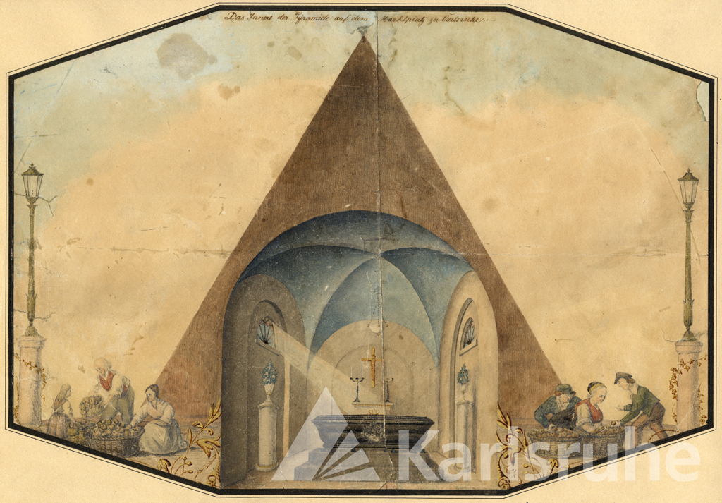Dieses Objekt zeigt eine colorierte Bleistiftzeichnung aus der Mitte des 19. Jahrhunderts, in der der Künstler seine Vorstellung vom Innern der Pyramide festhielt - einen großen Altarraum, in dessen Mitte der Sarg des Markgrafen aufgebahrt ist. In Wirklichkeit sieht es in der von Friedrich Weinbrenner entworfenen Steinpyramide jedoch ganz anders aus.