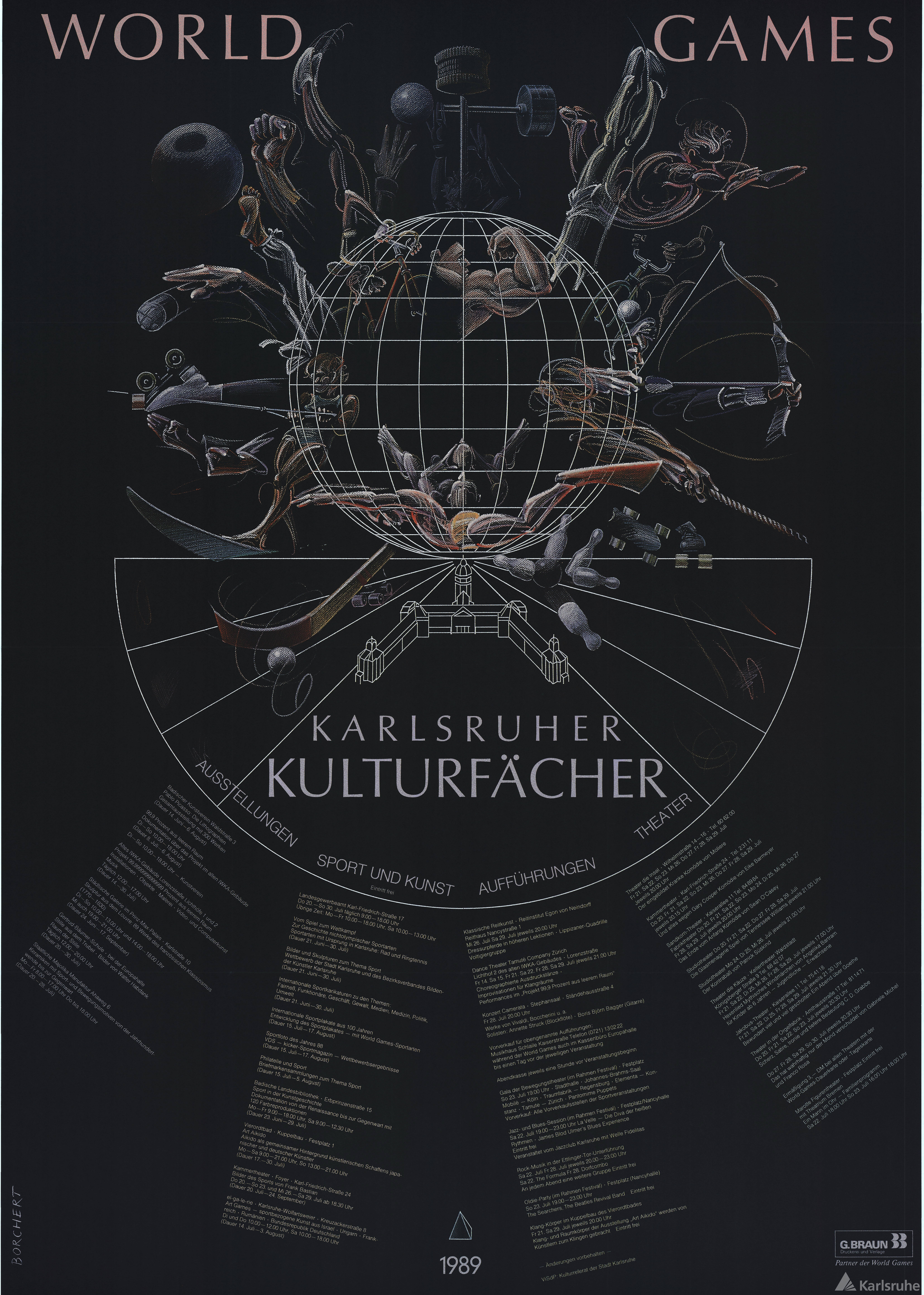 Der zweite Erfolgsgarant war ein umfangreiches sportliches und kulturelles Rahmenprogramm, das die Stadt auf den Weg brachte. Es bot den Gästen ein zweitägiges Festival, zehn auf sieben Karlsruher Bühnen aufgeführte Theaterstücke, zahlreiche Musik- und Tanzveranstaltungen, Fotowettbewerbe, wissenschaftliche Symposien, eine Spielstraße, Familientage und etliche Ausstellungen. Das Landesgewerbeamt, heute Regierungspräsidium Karlsruhe , zeigte gleich sechs Ausstellungen zum Thema Sport: Präsentiert wurden Karikaturen, Plakate, Malereien, Briefmarken, Fotografien und nicht zuletzt eine Dokumentation zur Geschichte der nicht-olympischen Sportarten. Die Vielfalt der sportlichen und kulturellen Angebote symbolisierte der von dem Maler und Grafiker Hans Borchert geschaffene "Karlsruher Kulturfächer" - einem Plakat, welches das Begleitprogramm enthielt. Es zeigt vor dunklem Hintergrund die 21 auf den World Games vertretenen Wettkampfsportarten verwoben in einer Weltkugel. Diese ist oberhalb des Karlsruher Schlosses und der fächerförmig davon ausgehenden Straßen platziert.