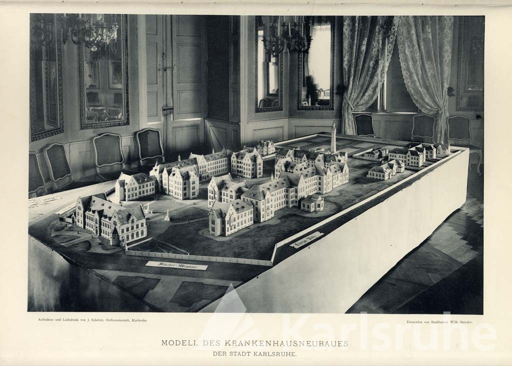Bereits die Suche und Wahl eines geeigneten Bauplatzes führten diese akribisch durch, ihre Vorstellung war ein Areal am Stadtrand mit angrenzenden Grünflächen, guter Luftqualität und auf einem Grund, der ihr Bauvorhaben stabil tragen konnte: Voraussetzungen für ein modernes und heilungsförderndes Krankenhaus. An der Moltkestraße, westlich des Karlsruher Schlosses, wurde 1903 der Grundstein gelegt, 1907 öffnete das Städtische Krankenhaus hier als Ensemble von zehn einzelnen Gebäuden seine Tore.
