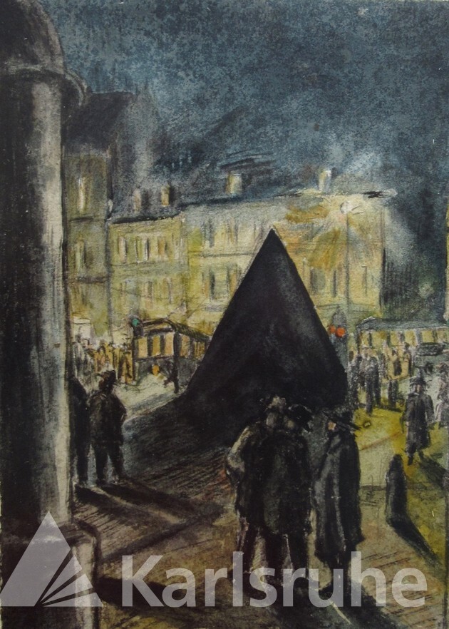 Dunkel ragt die Pyramide in der Mitte des Bildes auf. Um sie herum stehen kleine Menschengruppen, einige Passanten laufen vorbei. Im Hintergrund erleuchtet eine Straßenlaterne eine Häuserzeile. Rolf Müller-Landau (1903-1956) fängt in seinem Aquarell eine abendliche Szene am Karlsruher Marktplatz ein. Das Kunstwerk entstand während seines Studiums als Meisterschüler bei Ernst Würtenberger an der Badischen Landeskunstschule Karlsruhe (heute: Staatliche Akademie der Bildenden Künste Karlsruhe). Nach seinem Studium ließ sich Rolf Müller in Landau in der Pfalz als freischaffender Künstler nieder und nahm den Zusatz "Landau" in seinen Namen auf.