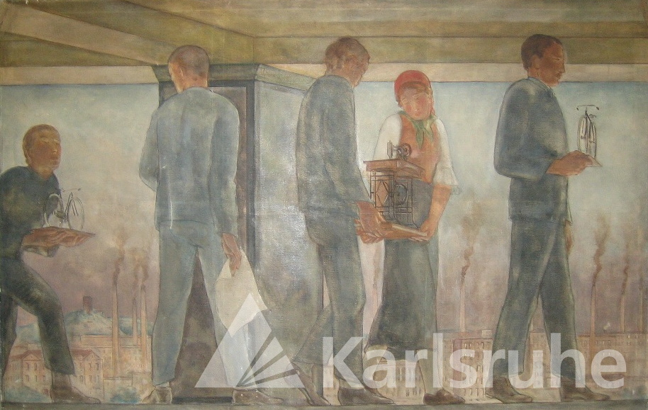 Das abgebildete Gemälde zeigt - stellvertretend für die Nähmaschinen- und Fahrradindustrie - die Maschinenfabrik Gritzner in Durlach. Fünf Personen schreiten von links nach rechts durch den Bildvordergrund. Die erste und die letzte Person tragen jeweils ein Fahrradmodell, während an zweiter Stelle des Zuges ein Mann und eine Frau gemeinsam eine Nähmaschine tragen. Die Frau mit ihrem roten Kopftuch - übrigens die einzige weibliche Person auf den sieben Gemälden - erinnert an eine Werbefigur, die vor allem von den Blechschildern der Gritzner'schen Nähmaschinenwerbung bekannt ist. Eine weitere männliche Person ist als Rückenfigur gegeben, sie hält ein Papier in der rechten Hand. Im Hintergrund ist die Fabrikanlage mit ihren rauchenden Schloten zu erkennen, darüber im linken Viertel des Bildhintergrundes der Turmberg.